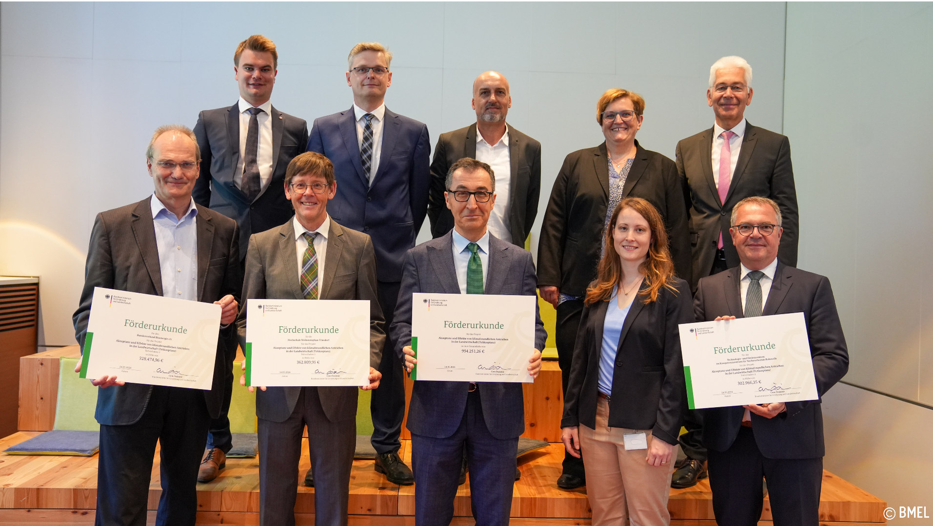 Bildunterschrift: Bundesminister Cem Özdemir (unten, 3.v.l.) überreicht die symbolischen Förderbescheide an Bernd Geisen, Geschäftsführer des Bundesverbands Bioenergie e.V., Prof. Dr. Klaus Menrad, Projektkoordinator an der Hochschule Weihenstephan-Triesdorf am TUM Campus Straubing, Carolin Winzer, Referentin an der Bundesanstalt für Landwirtschaft und Ernährung sowie Dr. Edgar Remmele, stellvertretender Leiter des Technologie- und Förderzentrums (v.l.n.r., untere Reihe).