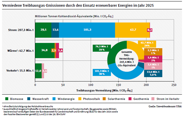Insgesamt wurden im Jahr 2025 durch den Einsatz erneuerbarer Energien rund 265 Mio. Tonnen CO2-Äquivalente vermieden. Auf den Stromsektor entfielen rund 207 Mio. Tonnen CO2-Äquivalente. Hiervon Einsparungen von 30 Mio. Tonnen CO2-Äquivalente durch den Einsatz von Biomasse in der Stromproduktion.